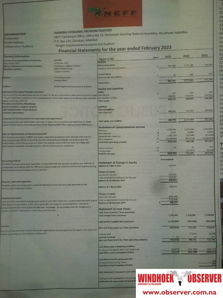 The Namibia Economic Freedom Fighters (NEFF) has published its financial statement for the year ending in February 2023 in a daily newspaper.